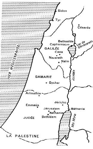 Jésus Christ naquit donc il y a près de 2000 ans, dans une région du monde appelée Palestine. Lorsque l'on prend une carte du globe terrestre, il est bien difficile de distinguer où se trouve la Palestine. Petit pays situé sur la côte Est de la mer Méditerranée, long de 200 kilomètres et large de 40 à 65 kilomètres, il se compose au temps de Jésus de diverses provinces. Les trois principales provinces dans lesquelles Jésus se déplacera sont : la Judée, la Galilée et la Samarie.